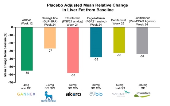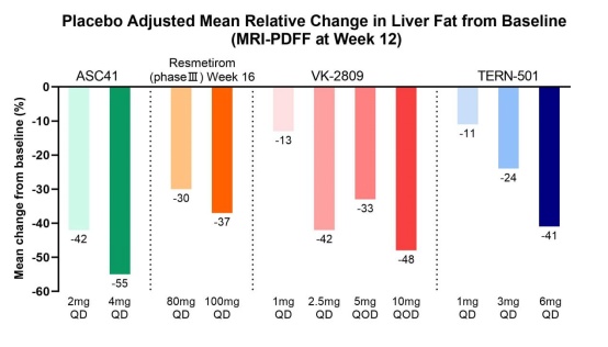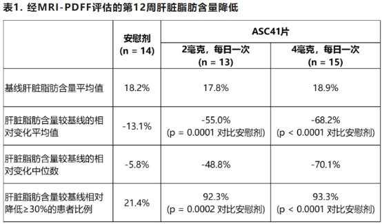 期中结果显示:经磁共振成像质子密度脂肪分数(MRI-PDFF)评估,患者服用ASC41片12周后,肝脏脂肪含量较基线的相对降幅平均值高达68.2%,且肝脏脂肪含量、肝脏炎症生物标志物ALT和AST及血脂数据均较基线出现显著降低。其中,高达93.3%的患者肝脏脂肪含量较基线相对降低30%及以上。