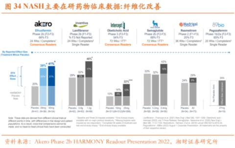 实际上,由于对纤维化程度更重的患者,需要在更短的时间内阻止患者进展到肝硬化,因此对于纤维化程度的改善一直是衡量NASH药物有效性的关键指标之一。如FDA规定NASH药物III期临床试验的替代终点必须采用肝穿刺活组织进行病理学评价,要求观察到的指标之一就是肝纤维化程度改善且脂肪肝炎没有恶化。