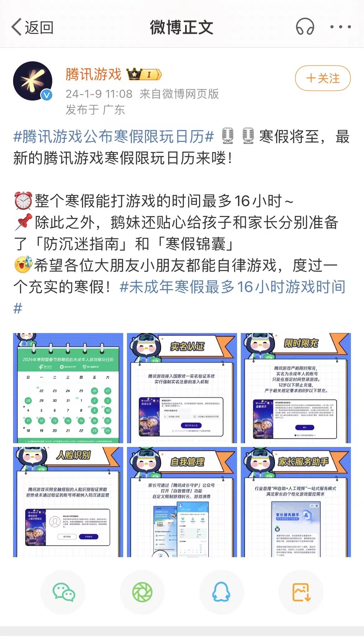 智通财经APP获悉,1月9日,腾讯(00700)旗下腾讯游戏官方微博发布“2024年寒假暨春节假期未成年人游戏限玩通知”。根据通知,今年寒假未成年人最多可以游玩总计16个小时的游戏,同比2023年寒假多出了2小时。