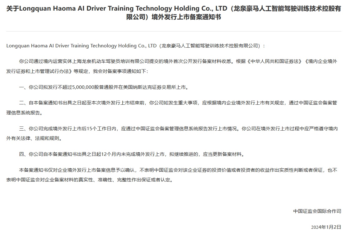 智通财经APP获悉,1月9日,中国证监会发布关于《关于Longquan Haoma AI Driver Training Technology Holding Co., LTD(龙泉豪马人工智能驾驶训练技术控股有限公司)境外发行上市备案通知书》。公司拟发行不超过500万股普通股并在美国纳斯达克证券交易所上市。