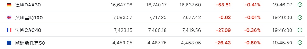 2. 截至发稿,德国DAX指数跌0.41%,英国富时100指数跌0.01%,法国CAC40指数跌0.36%,欧洲斯托克50指数跌0.59%。