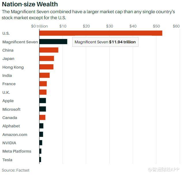 这七家公司的市值与英国、加拿大和日本的整个股市市值相当。仅苹果或微软一家公司的规模就相当于加拿大整个股市的规模。