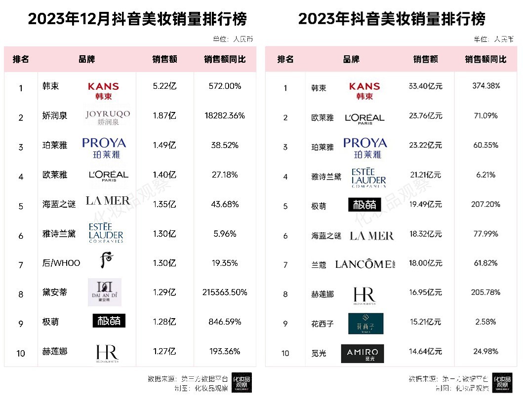 而站在年末,纵观抖音美妆全年数据,韩束凭借2023年总GMV33.4亿元,同比增长374.38%,位居第一。韩束带领国货美妆在抖音正式敲开30亿量级的大门,一个全新的时代正在被书写!