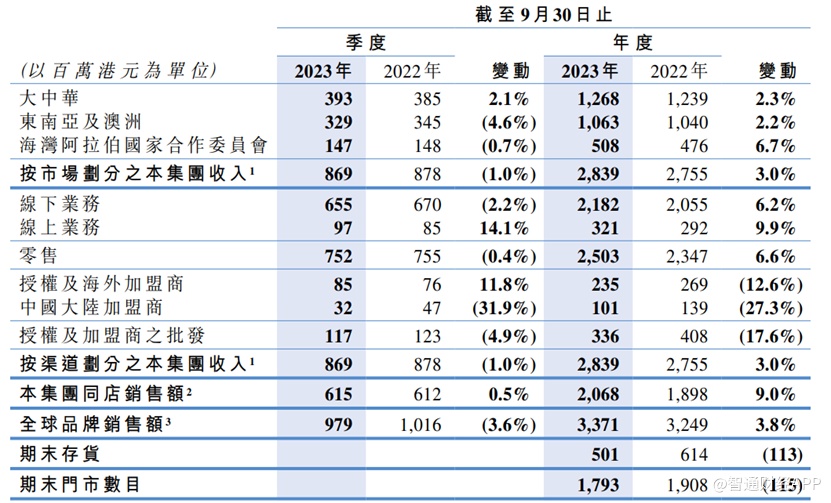 而从不同市场来看,公司的海外业务比国内业务录得更高的同比增速,第三季度公司海外加盟商收入上升11.8%,中国大陆加盟商收入则下降31.9%,在整个前三季度中总计下降27.3%。