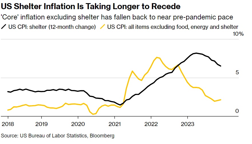 但是自那以来,住房通胀率一直在下降,截至11月降至6.5%左右,而且经济学家普遍预计将继续减速。但进展相对缓慢,因为住房部分是一个滞后指标,尚未完全反映2023年租金增长放缓的情况。这在一定程度上是因为人们只有在租约续签或搬到新地方时才会看到租金的变化。