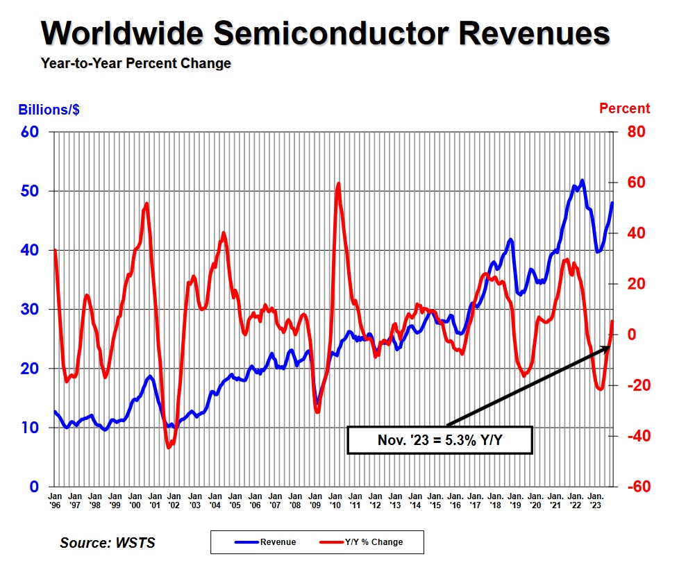 SIA总裁兼首席执行官John Neuffer表示:“11月份全球半导体销售额自2022年8月以来首次同比增长,这表明在我们进入新的一年之际,全球芯片市场继续走强。展望未来,预计2024年全球半导体市场将实现两位数的增长。”