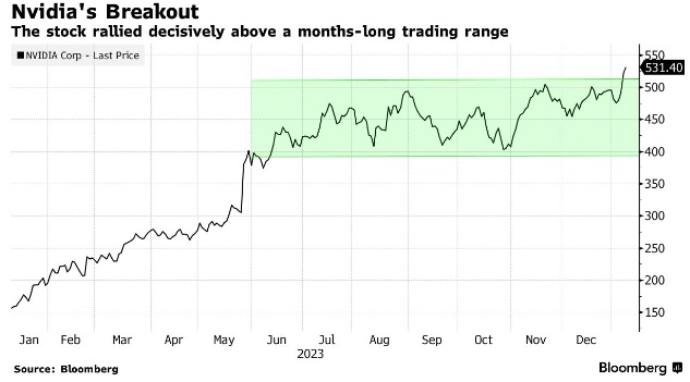 英伟达在2023年涨了两倍多之后,投资者仍在推高该公司的股价,这一事实证明,市场对其用于人工智能计算的芯片的需求预期仍然很高。根据收集的数据,英伟达第三季度的收入增长了206%,预计第四季度将增长232%。