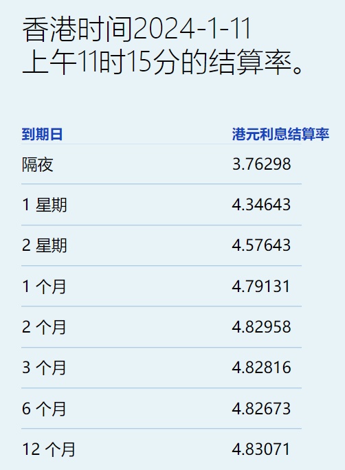 智通财经APP获悉,港元拆息连续两日全线下跌。1月11日,一个月及三个月期齐创2023年9月12日以来最低。其中,与楼按相关的一个月拆息连跌两天,报4.79131%,反映资金成本的三个月拆息则报4.82816%,比同期美元LIBOR低近76基点。隔夜拆息则再跌近11基点至3.762983%,续创近一个月新低,而一周拆息报4.34643%。长息方面,六个月及一年期拆息分别报4.82673%和4.83071%。