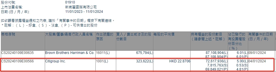 智通财经APP获悉,香港联交所最新资料显示,1月4日,Citigroup Inc.增持新秀丽(01910)32.3622万股,每股作价22.8706港元,总金额约为740.14万港元。增持后最新持股数目约为7261.79万股,最新持股比例为5%。