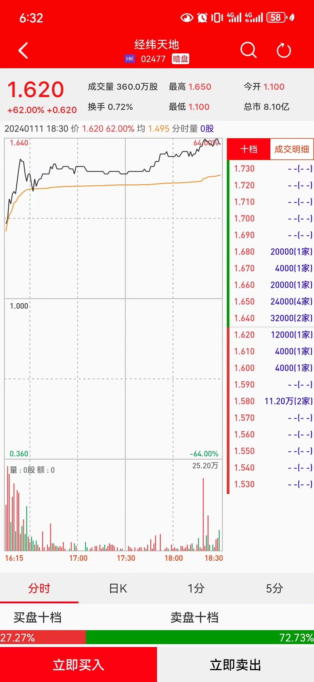 智通财经APP获悉,经纬天地(02477)将于1月12日(周五)在香港挂牌。截至收盘,利弗莫尔证券暗盘交易显示报价1.62港元,较招股价1.00港元上涨62%。每手4000股,不计手续费,每手赚2480港元。