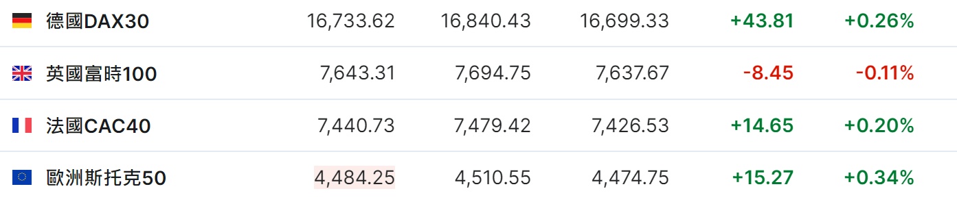 2. 截至发稿,德国DAX指数涨0.26%,英国富时100指数跌0.11%,法国CAC40指数涨0.20%,欧洲斯托克50指数涨0.34%。