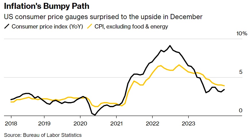 智通财经APP获悉,最新美国CPI数据显示,住房通胀助力美国通胀在2023年年底加速上行,继上周被超预期火热的非农就业数据重创后,市场对于美联储3月开始降息且高达150基点的“降息狂欢”再度遭受来自CPI的重大打击。美国劳工统计局(Bureau of Labor Statistics)公布的最新数据显示,在2023年12月,美国消费者价格指数(CPI)同比上涨3.4%,为三个月以来最大涨幅,高于经济学家们普遍预期的3.2%,以及11月的3.1%。按月计算,该指数的涨幅也高于预期,环比增速升至0.3%,高于前值0.1%和经济学家们预期的0.2%。