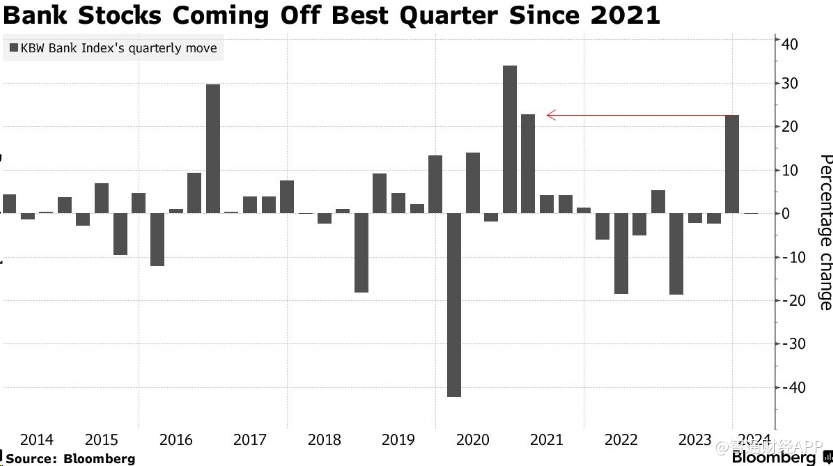 上季度,随着美联储2024年降息的前景缓解了对净息差的担忧,美国银行股的走势发生了逆转。