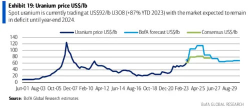 美国银行的金属及矿业团队表示,铀市场的紧张状况可能会延续到2025年,这表明今年全年铀价可能会继续走高。该团队目前预计,铀现货价格将在2024年升至每磅105美元,在2025年升至每磅115美元。他们指出,近期可能推高铀价的三个催化剂包括:更高的电价使得更高的铀价更容易被接受、投资基金规模持续增加、库存低于此前预期且生产仍存在下滑风险。