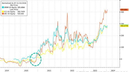 自2020年12月以来,铀价飙升推动Cameco(CCJ.US)等矿业公司的股价上涨了近300%,Sprott Uranium Miners ETF也上涨了近300%,Uranium Energy(UEC.US)的股价上涨了416%。