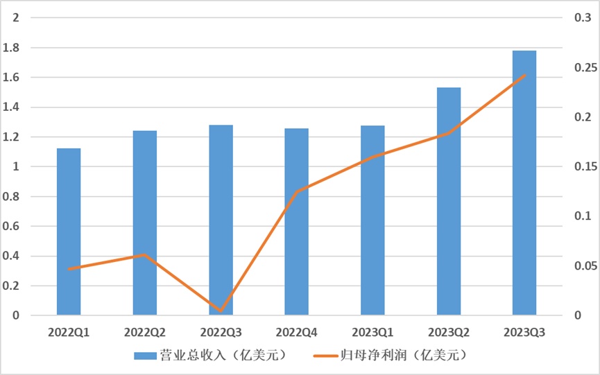 根据最新财报显示,该公司Q3总营收为1.782亿美元,同比增长39.2%;净利润为2420万美元,同比增长3357.1%;基本及摊薄每股收益为0.59美元,上年同期为0.01美元。近5个季度以来,公司业绩持续表现出强劲的增长态势。