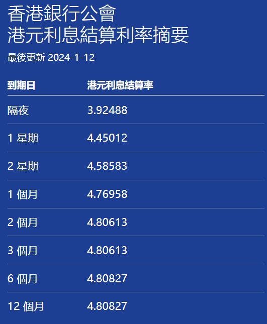 智通财经APP获悉,1月12日,港元拆息短期回升,其中,隔夜息结束三连跌,升至3.92488%,一周钱亦回升至4.45012%,但与楼按相关的一个月拆息连跌三天,报4.76958%,见四个月新低。