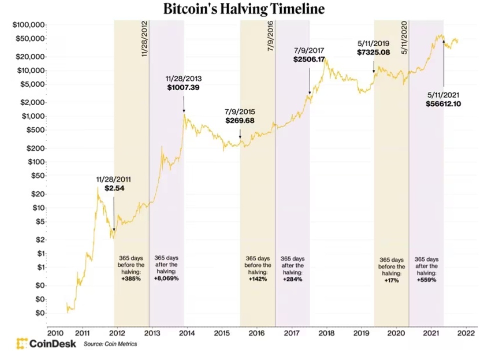 每四年发生一次的“减半”是指用比特币代码编写的事件,即所谓的矿工挖比特币获得的奖励被削减了一半。这就限制了比特币的供应规模,毕竟底层机制决定了比特币的供应量永远只有2100万。在之前的价格周期中,减半通常发生在比特币价格大幅上涨之前。