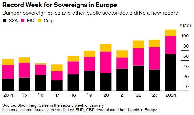 根据数据,本周通过银行向政府借款超过410亿欧元(450亿美元),创历史新高,本周欧洲债券销售总额超过1200亿欧元,创下历史新高。虽然1月份通常需求强劲,但对订单量的分析显示,来自亚洲和中东的需求增加。