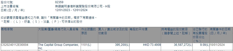 智通财经APP获悉,香港联交所最新资料显示,1月10日,美国资本集团增持药明康德(02359)39.52万股,每股作价73.4909港元,总金额约为2904.36万港元。增持后最新持股数目约为3658.73万股,最新持股比例为9.09%。