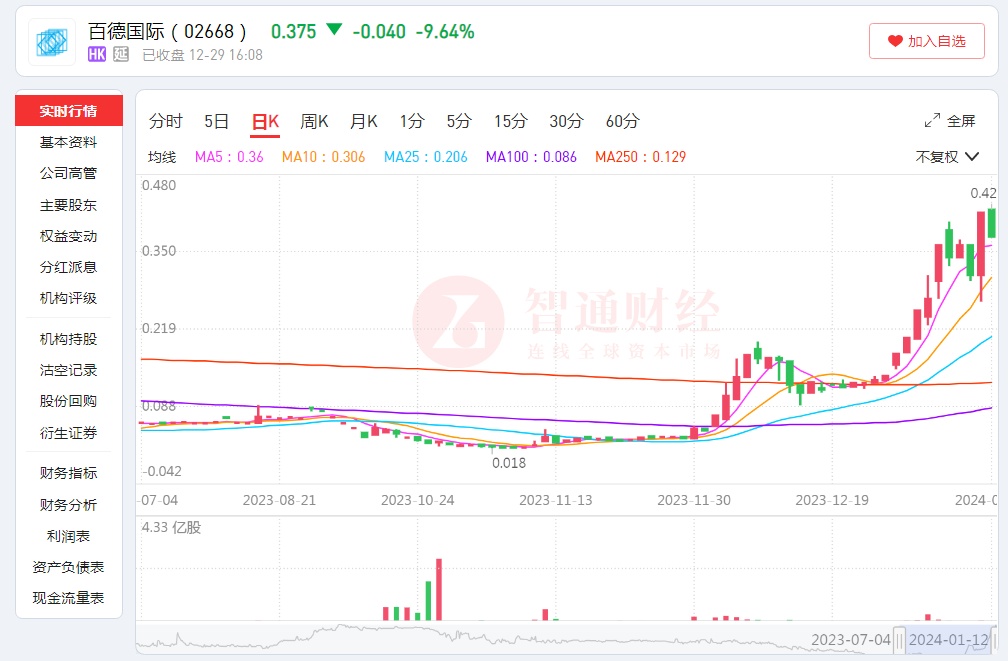 具体而言,自2023年11月8日起,长期徘徊在0.02港元一下的百德国际,便开启来其强势拉升的旅程。迄今为止,45个交易日,其股价累涨约1875%。至2024年1月12日收盘,其股价为0.375港元,总市值为17.55亿港元。