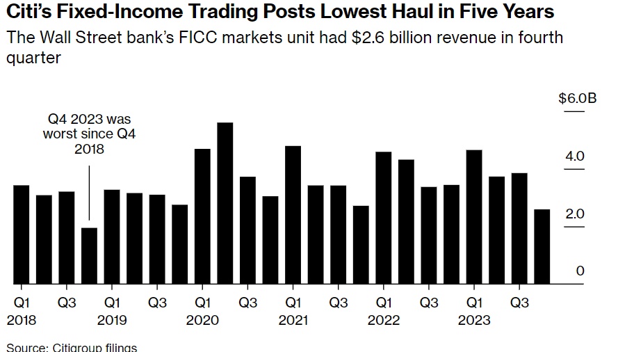花旗固定收益交易收入创下五年来新低——这家华尔街大行的FICC市场部门去年第四季度的收入为26亿美元