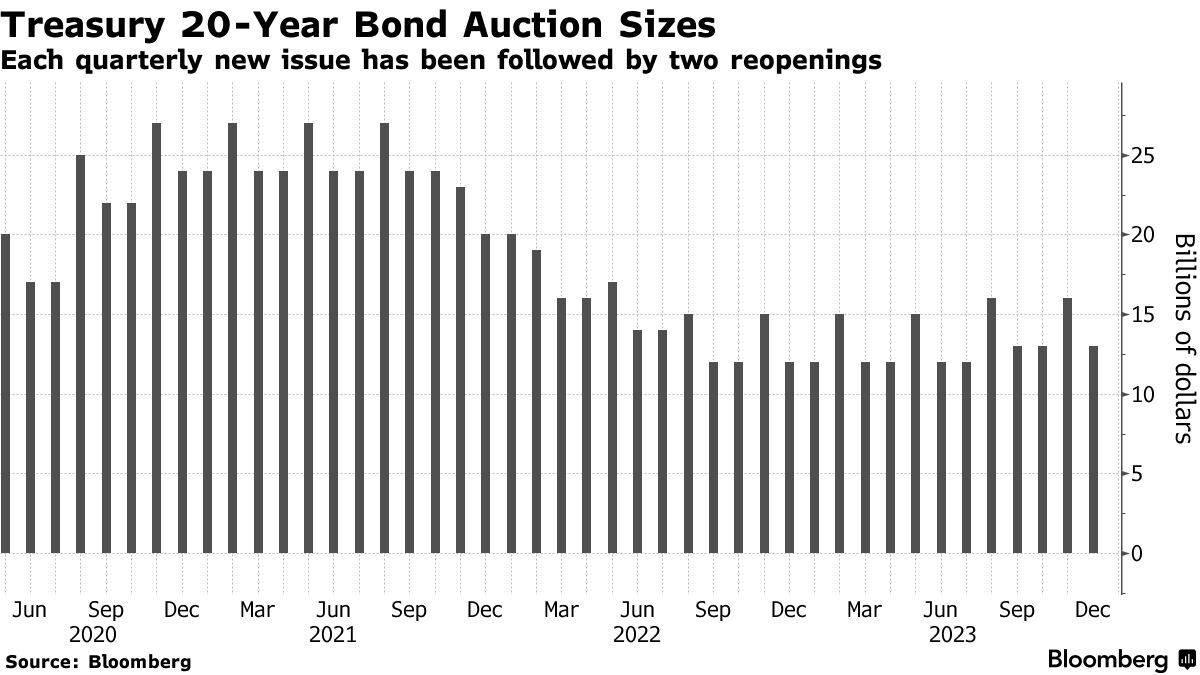 美国财政部在2022年年中将20年期美债的发行规模不成比例地削减至390亿美元。当美国财政部在去年8月恢复增加票据和债券拍卖规模时,20年期美债的发行规模增幅很小,达420亿美元。去年11月,尽管美国财政部其他六个期限美债的发行规模有所增加,但20年期美债的发行规模仍保持在这一水平。