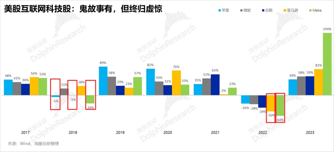 而站2024年这个节点上,巨头的估值修复基本都已再中性偏乐观状态,2024年除非AI能够大幅度提升效率,出现超预期的降本增效,在海豚君看来相对2023年,应该是巨头们的创造超额收益的小年。