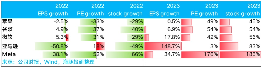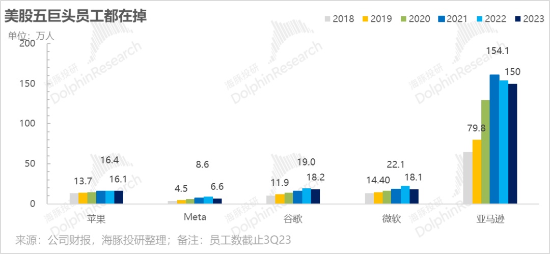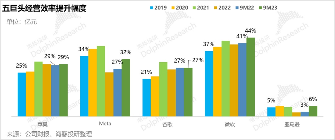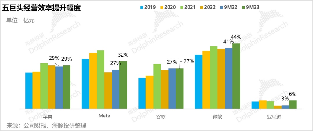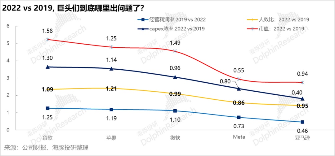 3)而最终的经营效率提升上,提升幅度最为明显的,主要也还是Meta和亚马逊。本来问题就不大的谷歌和苹果则相对平平。