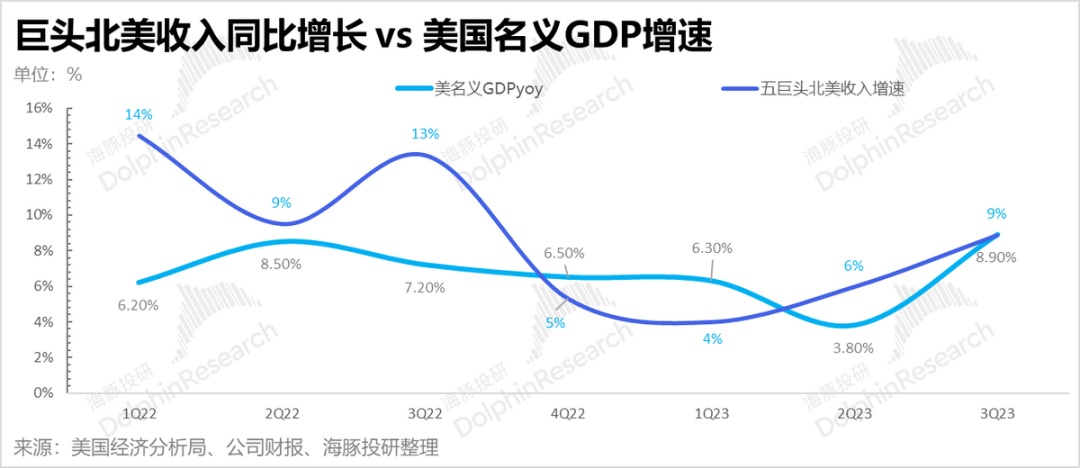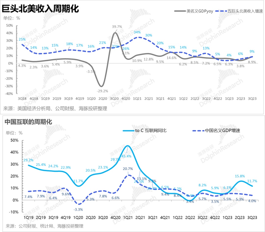 但一个反直觉的地方是,事实上美国互联网的周期化比中国更为严重:美国互联网巨头的收入增速基本已经与名义GDP增长同步,但以3Q23作为观察节点考虑进入字节中国的收入,中国的互联网商业成长性还能明显超出GDP的增长。