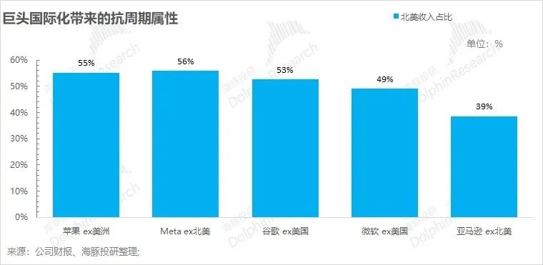 只是相比中国的互联网巨头,美股互联网巨头海外普遍占比在50%上下,国际化的成功,也意味着当美国经济走弱、美元走弱的时候,汇率贬值能够带来非美收入增速的提高,相比美国的同行具有更好的抗周期性特征。而这波美国经济走强、美元走强当中,有本土收入坐镇,收入表现也不会太差。