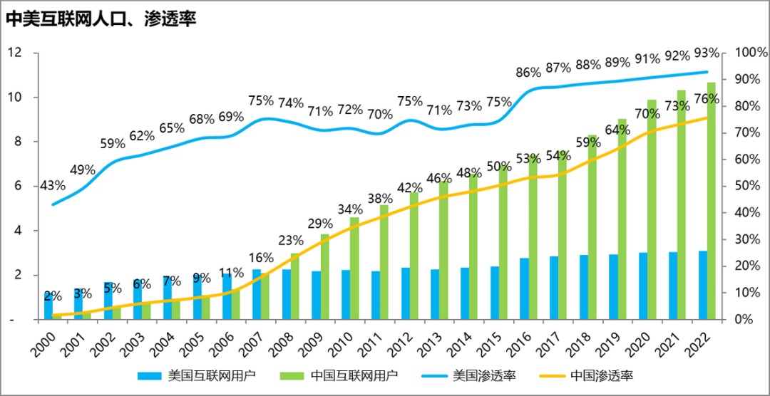 1)底层人口上,中国大量农村常驻人口基本决定了中国网民的渗透率一直低于美国。中国农村人口网络普及率的上升,硬件端是通过智能手机的下沉、软件端是通过短视频消费的渗透率提升,对应的时间是2017-2020年。而美国则发生在2015-2016年,一次性非线性提升了11个百分点,之后再次进入稳定状态。