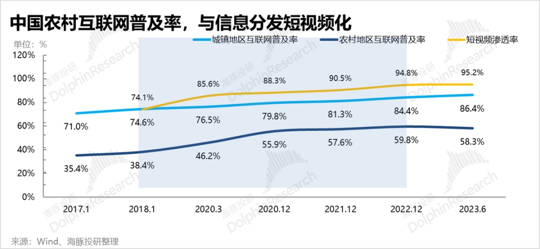 2)中国城乡二元结构严重的情况下,以下沉市场为主的二次人口线上化,导致互联网的消费形态发生了大幅的变化,才有了APP端下沉三宝——图文消费趣头条、电商购物拼多多和短视频消费快手。而三年疫情更是催熟了中国的短视频消费,从2020到2023年6月,渗透率拉升了10个百分点。