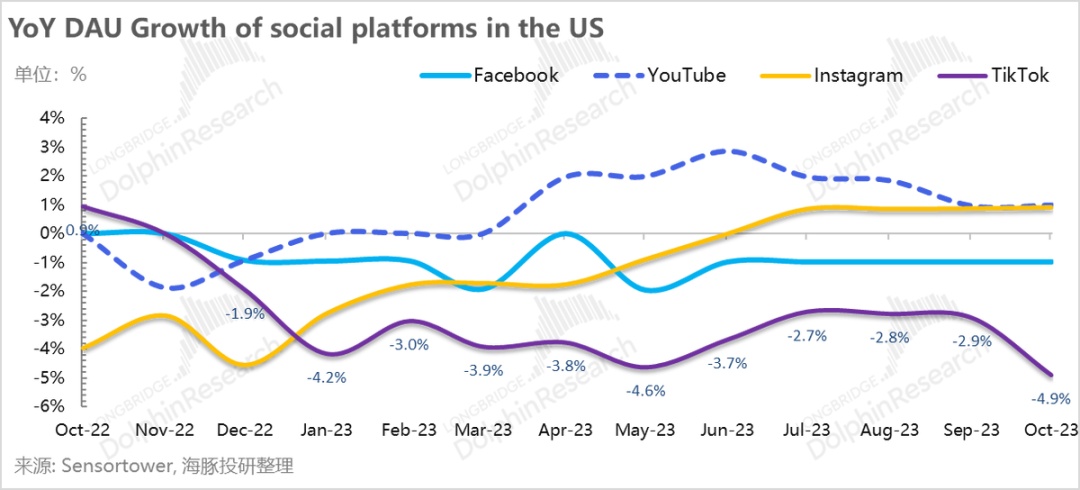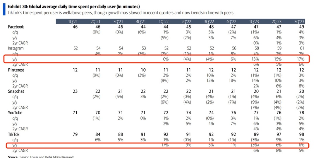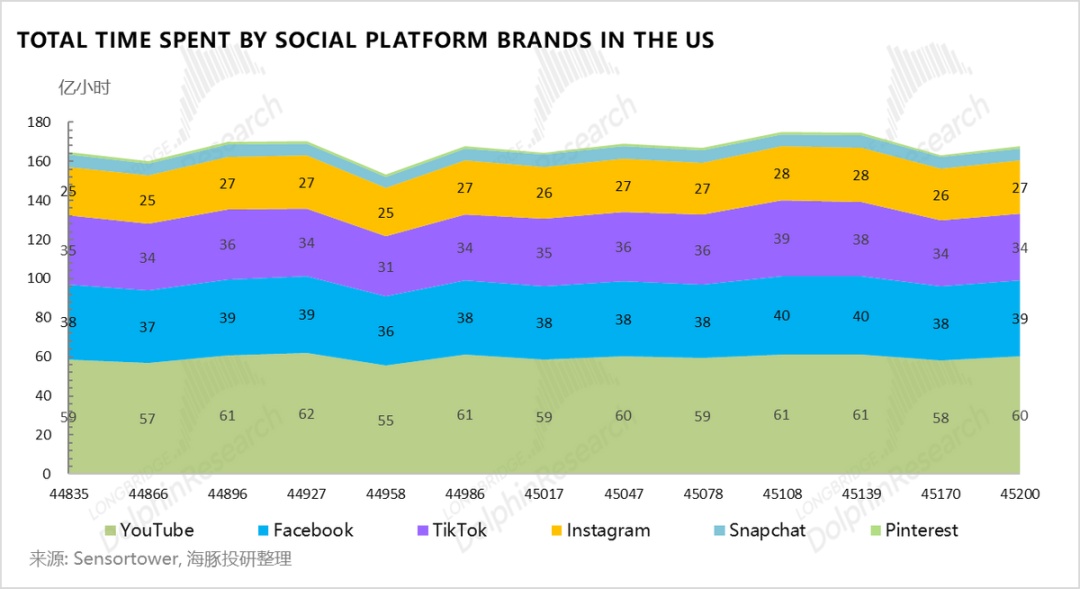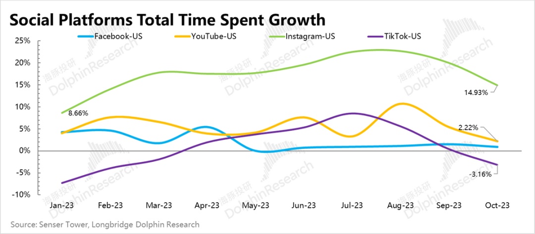 关键是经过三年疫情催化带来的总时长增长之后,进入2023年之后,美国社交平台(Facebook, Youtube, IG和Tiktok) 总时长高增长已经不再,完全变成了时长的内部转移。