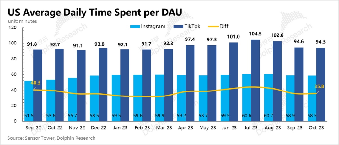 Ins上Reels的时长则更贴近视频号目前的用户时长。整体来看,目前的单用户时长上,中美短视频并无本质区别。
