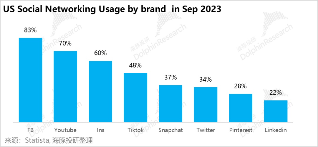 主要的问题是出在总的用户数上,美国的短视频跑过飙涨期,无论是Ins还是Tiktok在美国网民中的渗透率还只在50%-60%的水平上(经互联网渗透率调整),距离渗透率最高的互联网消费形态熟人社交(以Facebook为代表83%),还有不少距离。