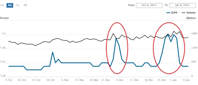 所以在11月至12月和年底期间,担保隔夜融资利率(SOFR)出现突发跳涨。寻常情况下,广义货币市场利率都远低于储备利率。