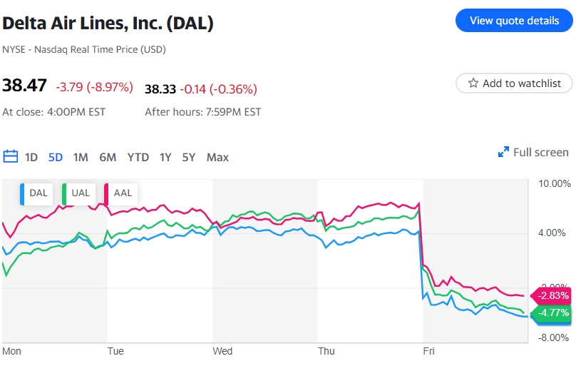 达美航空(DAL.US)业绩则拉开航空业业绩帷幕,但是达美航空的第四季度业绩令投资者感到极其失望,导致该公司股价下跌近9%,并大幅拖累了同行美国联合航空(UAL.US)和美国航空(AAL.US)的股价。