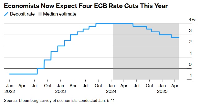 智通财经APP获悉,对经济学家进行的一项调查显示,随着通胀回落速度快于此前预期,欧洲央行今年将四次降息。