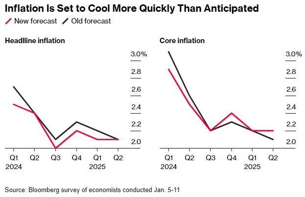经济学家现在预计,价格涨幅将以更快的速度回落,到2024年降至2.3%。与去年12月的调查相比,这一数据向下修正了0.3个百分点。他们仍然认为,随着通货膨胀从第四季度的目标水平再次加速到2025年的平均2.1%,未来的道路将会崎岖不平。