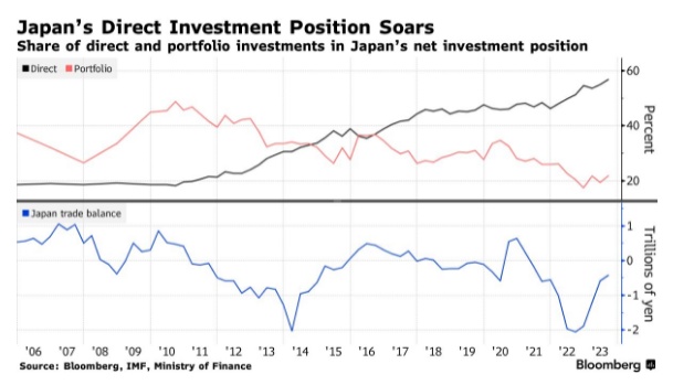 根据汇编的国际货币基金组织数据显示,第三季度,海外直接投资占日本净国际投资头寸的57%,高于2010年底的20%。在此期间,证券投资的份额从46%降至22%。