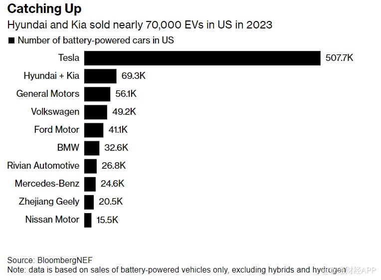 现代汽车正在乔治亚州建设电动汽车工厂,最早可能在2024年底开始组装汽车。根据 BloombergNEF的数据,现代汽车及其子公司起亚汽车在2023年在美国共售出69259辆电动汽车,是仅次于特斯拉(TSLA.US)的第二大电动汽车制造商。