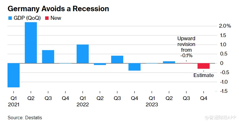 智通财经APP获悉,德国在能源危机之后避免了经济衰退,尽管经济前景仍然黯淡。根据德国联邦统计局周一公布的数据,德国2023年第四季度国内生产总值(GDP)环比下降0.3%。由于2023年第三季度的经济增长率从-0.1%修正为0%,这个欧洲最大的经济体避免了连续两个季度出现负增长。尽管如此,德国2023年全年GDP下降0.3%,这是疫情以来首次出现萎缩。