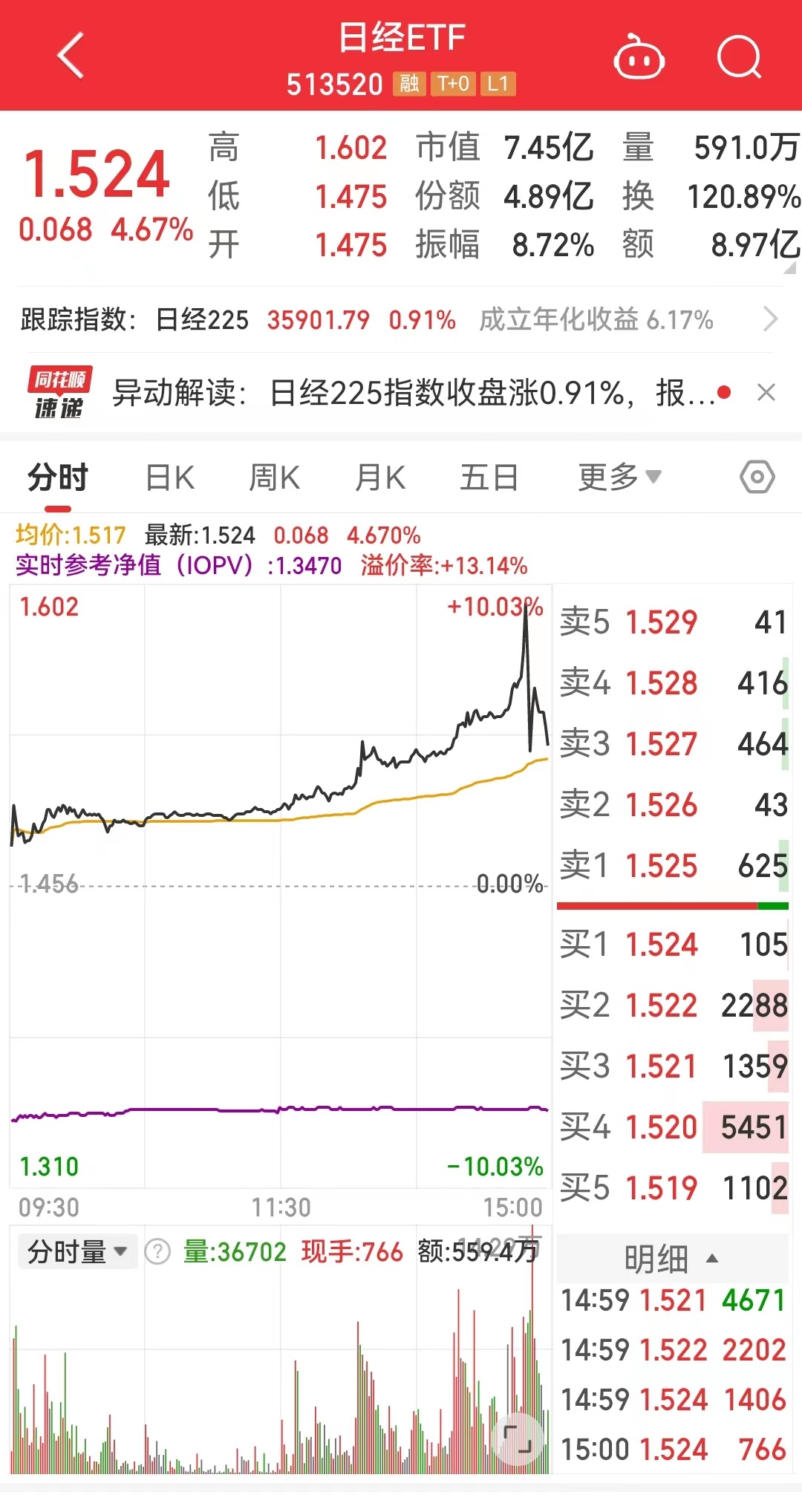 智通财经APP获悉,1月15日,日经225指数收报35901.79点,涨0.91%,连涨6日,续创34年新高。盘中指数一度涨破3.6万点,为1990年2月以来首次。日经ETF(513520)15日盘中一度触及涨停,溢价率逼近20%;截止收盘,涨幅收窄至4.67%,溢价率仍高达13.17%。