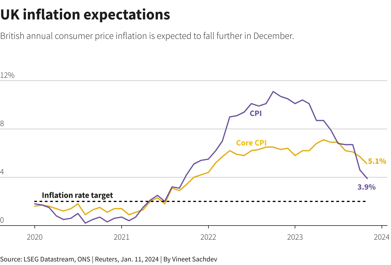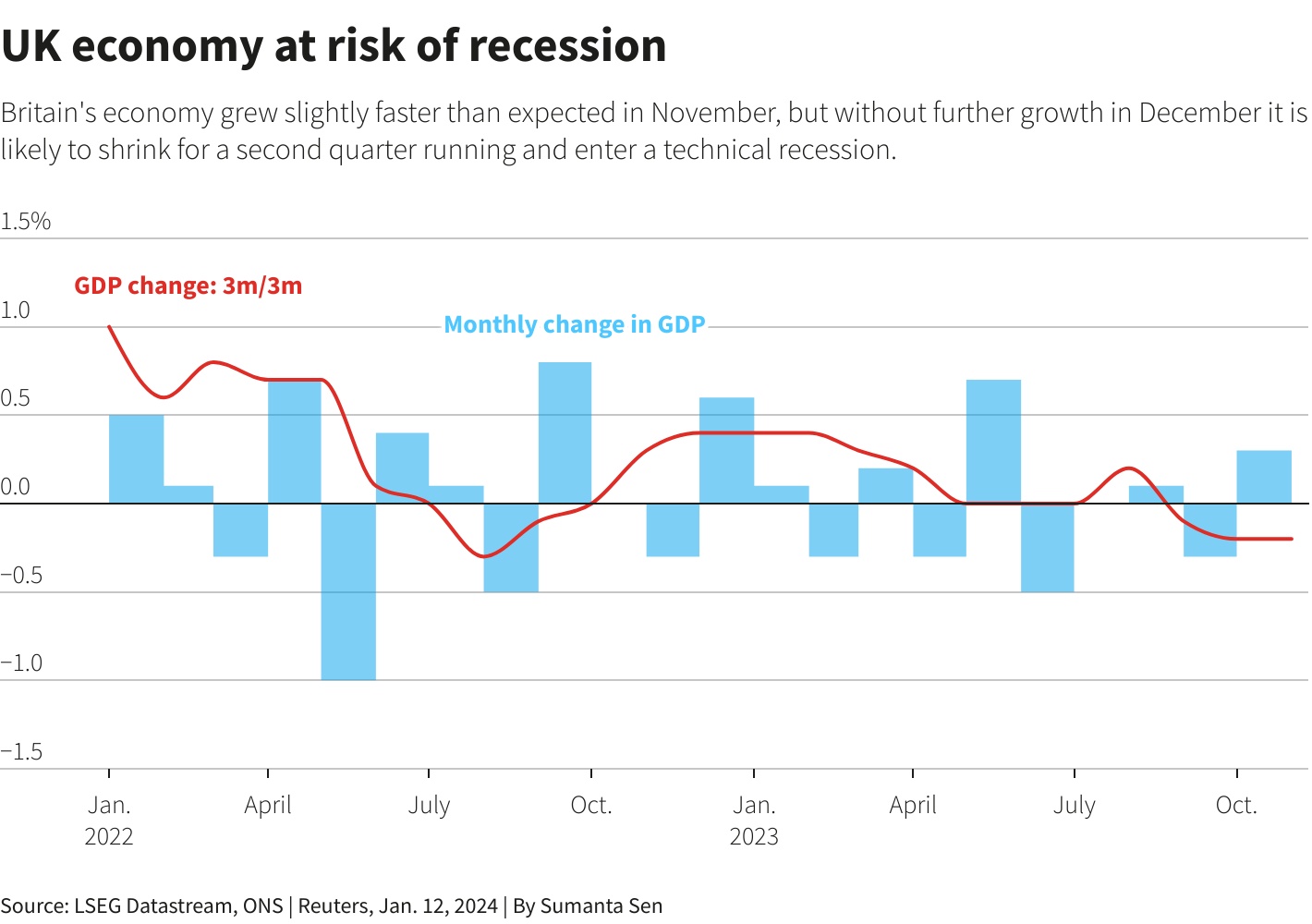 英国央行是否会在降息方面落后于美联储和欧洲央行是英镑面临的关键问题。市场目前预计英国央行将在2024年降息约120个基点,首次降息最有可能在5月。相比之下,市场预计美联储和欧洲央行将在2024年降息150个基点,并预计美联储和欧洲央行分别将在3月和4月开始降息。