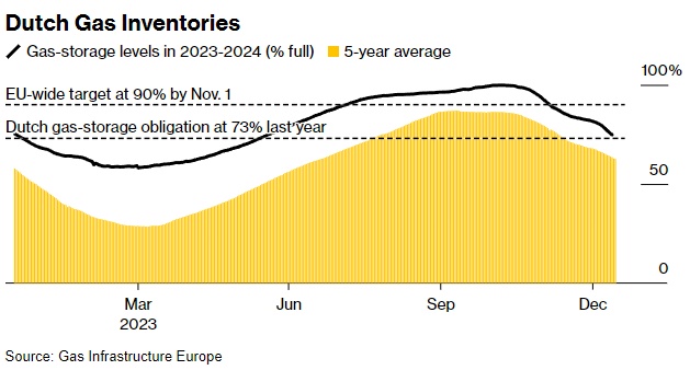 欧盟要求成员国须在2024年将储存水平维持在与去年的相同标准,即90%的水平。在2023年11月1日前,荷兰须达到73%的储量,不过荷兰的实际储量在当月初便已接近100%,在天气变冷激发供暖用气需求增加后,荷兰才开始使用这些储量。