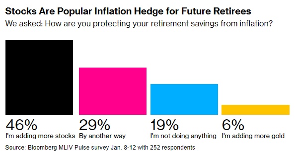 在252名受访者中,近一半的人表示,他们将把更多资金投入股市,以应对价格上涨,远远超过6%的人表示他们将增加传统的通胀对冲工具——黄金。