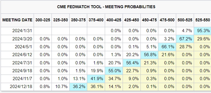 美联储官员们在2023年12月提供的最新FOMC点阵图以及最新经济预测数据显示,他们预计2024年将有三次降息,FOMC点阵图中值显示降息幅度总计75个基点。然而,全球金融市场却陷入一片“降息狂欢”之中,利率期货市场一度押注美联储2024年降息超过150个基点,并且押注美联储将于3月开始降息,3月降息概率一度接近90%。