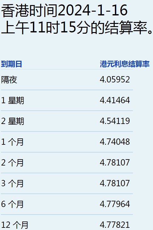 智通财经APP报道,1月16日,港元拆息全线下跌,其中,隔夜息结束两连升,今日回落71基点,报4.05952%,险守4%水平,一周拆息亦降至4.41464%。与楼按相关的一个月拆息连跌五天,报4.74048%,续创逾四个月新低。不过,反映资金成本的三个月拆息微跌至4.78107%,为9月11日以来最低,与同期美元LIBOR息差略为扩阔至80基点。长息方面,六个月及一年期拆息分别跌至4.77964%和4.77821%。