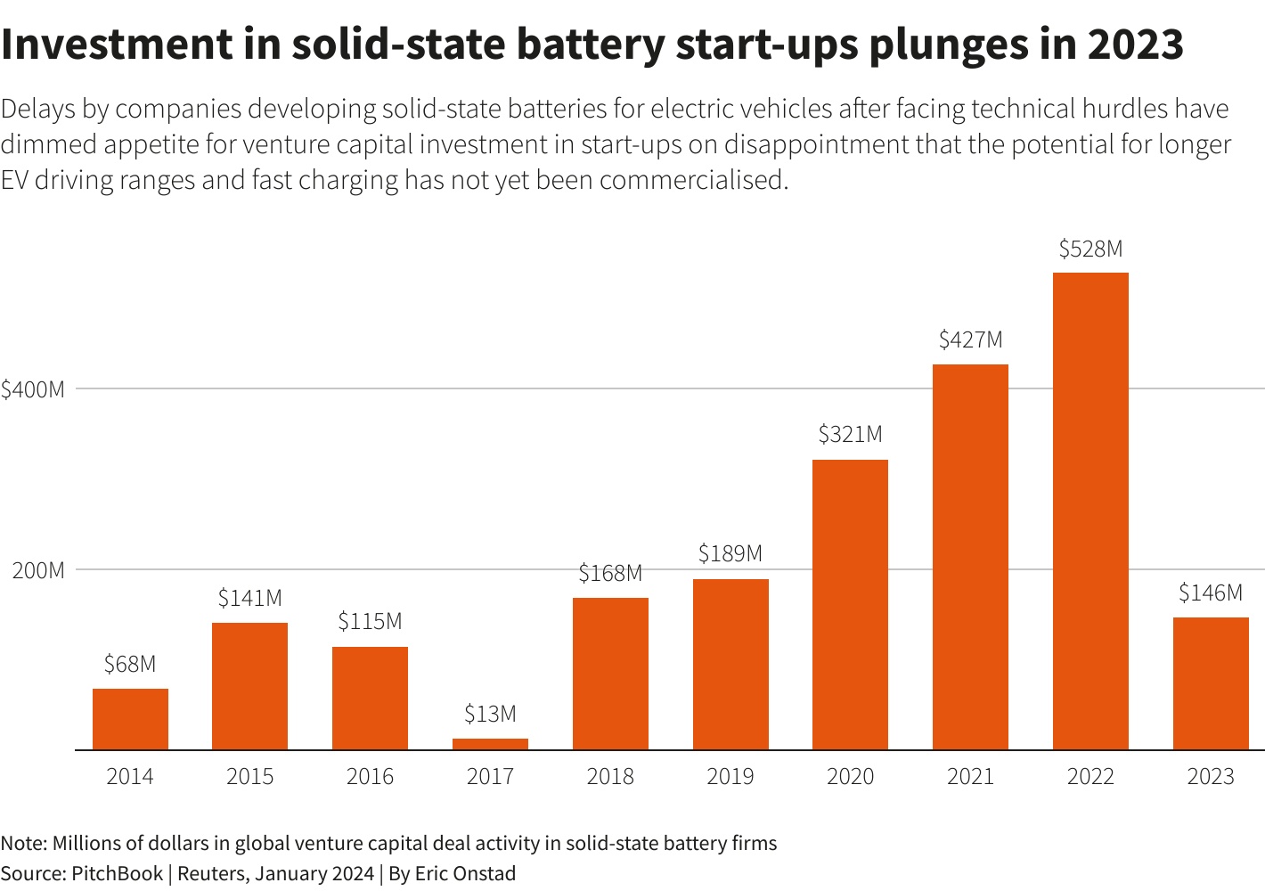 固态电池行业缺乏商业成功对市场热情造成了打击。PitchBook的数据显示,2023年固态电池公司的全球风险投资交易金额下降了72%,至1.46亿美元。Ibex Investors合伙人Jeff Peters表示:“投资者对固态电池的兴趣已经减弱。他们在质疑是否值得冒这个风险。”